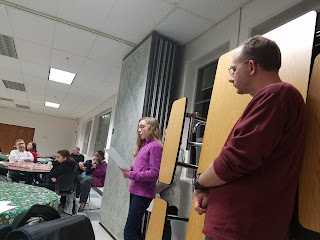 Sorry this is so late, but I only just now got my computer back after a misshap Christmas Eve. Here are pictures of our Advent Potluck, way back on December 19, and our Essay Contest Winners from SJF and St. Clare's reading their essays.